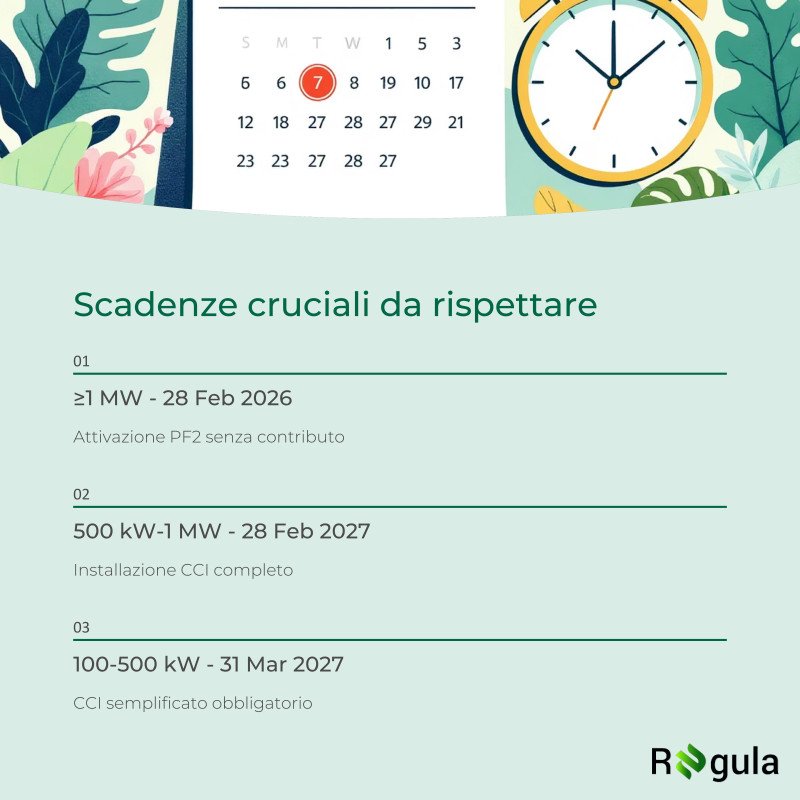 500 kW ≤ P < 1 MW | Entro 28/02/2026 | 01/03–30/06/2026 | 01/07–31/10/2026 | 01/11/2026–28/02/2027 |