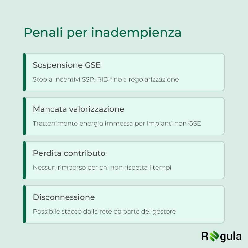 - Mancata valorizzazione dell’energia immessa: per gli impianti non in convenzione GSE (trattenimento temporaneo fino a regolarizzazione).
