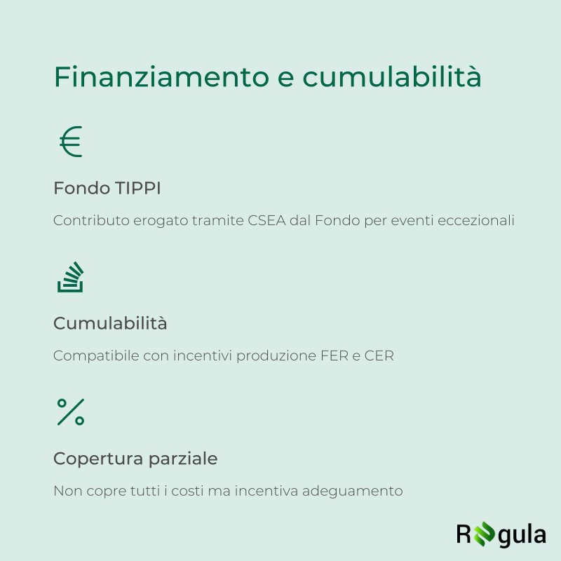 Il contributo forfetario è erogato dal Fondo per eventi eccezionali, resilienza e progetti speciali (TIPPI), tramite CSEA. Non copre integralmente i costi, ma incentiva l’adeguamento anticipato.